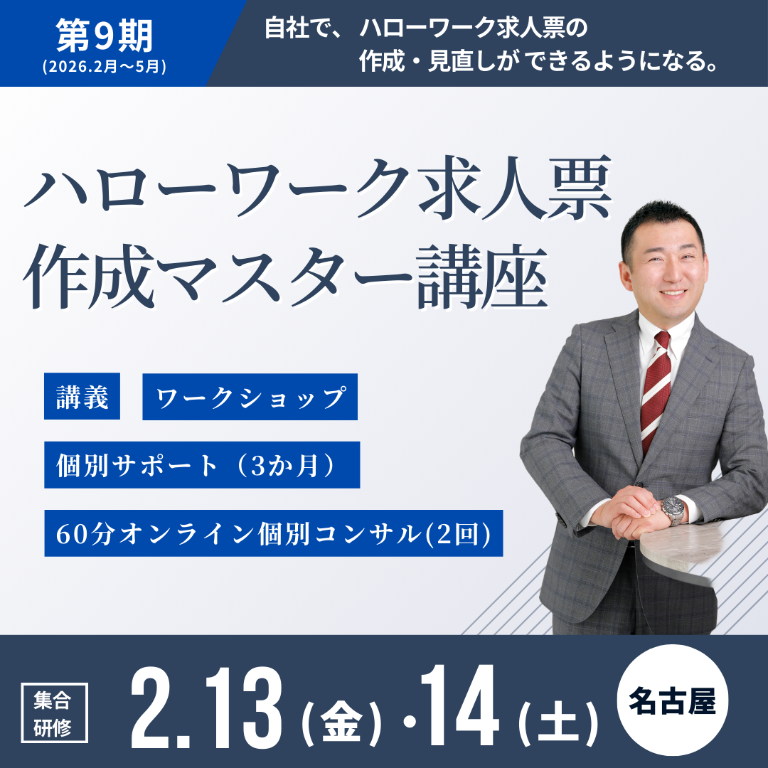 受付を開始しました。 「ハローワーク求人票作成マスター講座<第9期>」 ・リアル集合研修:2026年2月14日(金)・15日(土) 愛知会場 |