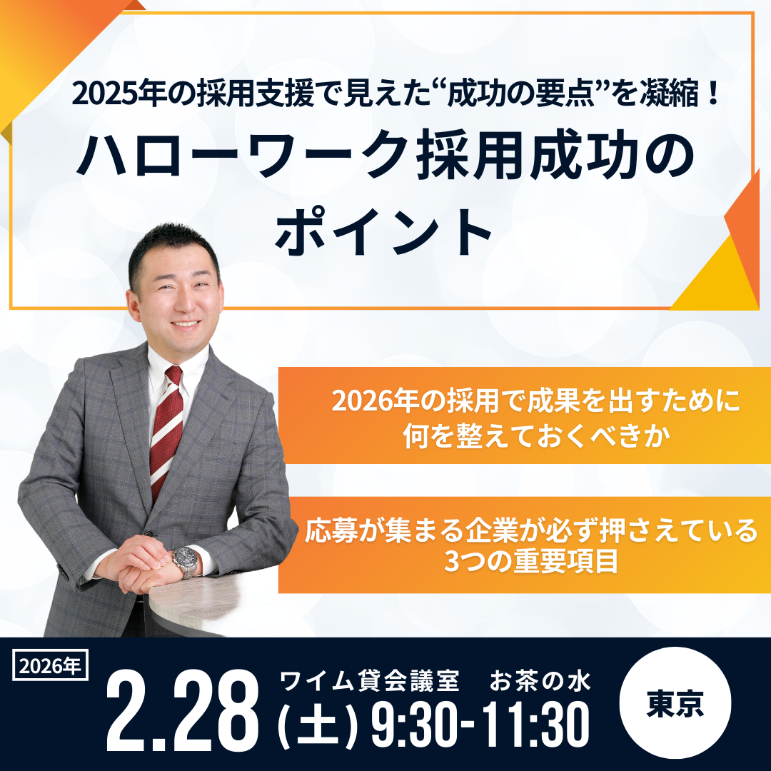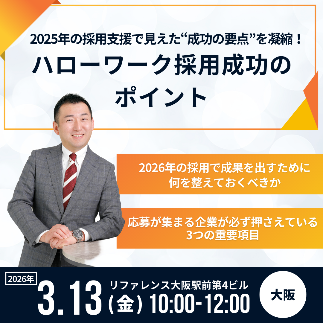 セミナーの開催が決定いたしました。 「ハローワーク採用成功のポイント」セミナー ・2026年1月15日(木)大分開催 ・2026年2月28日(土)東京開催 ・2026年3月13日(金)大阪開催 |